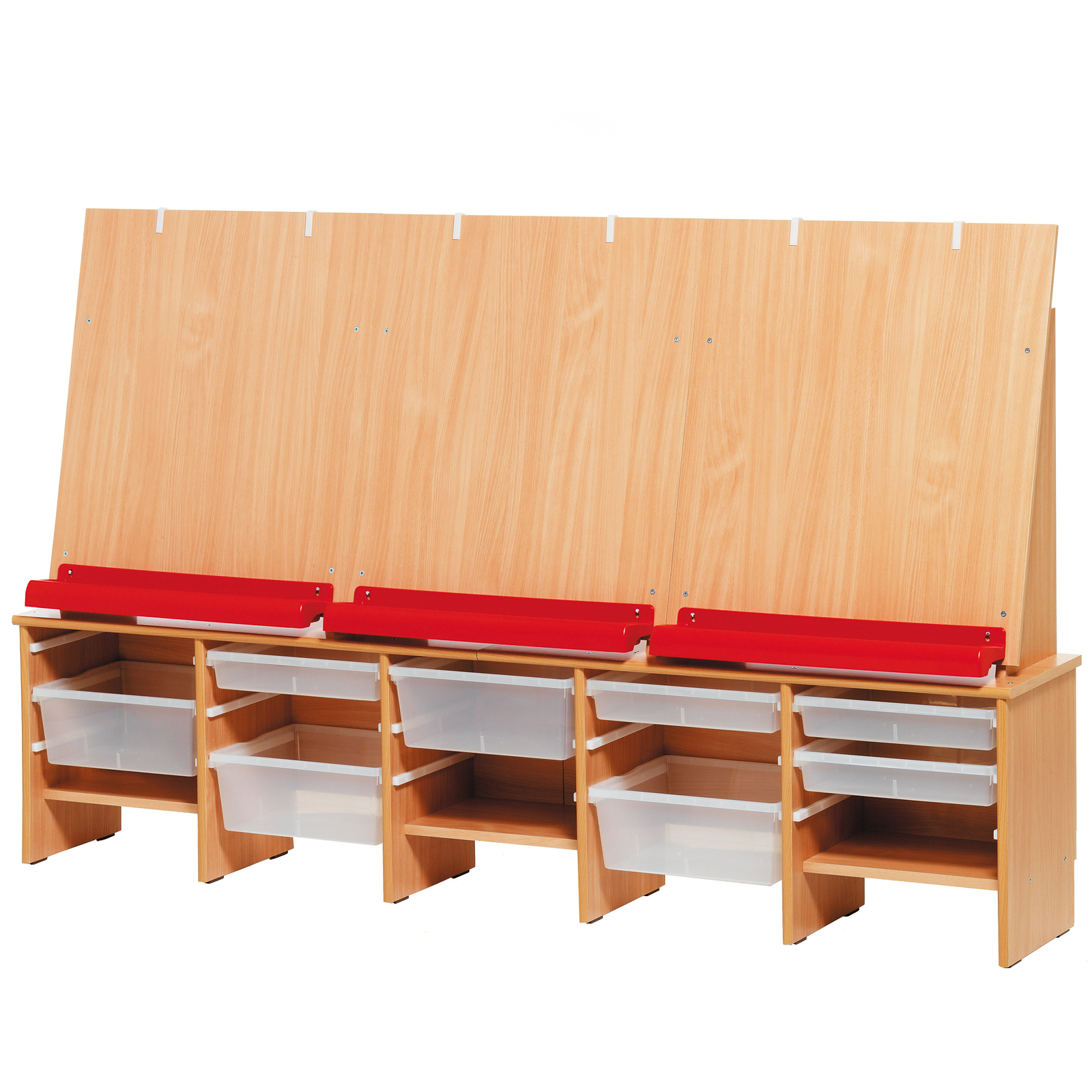 Chevalet compact + 6 bacs plats + 3 bacs profonds Dimension chevalet : L/prof./H : 200 x 32 x 122 cm.En mélaminé teinte hêtre.Livré à plat avec 1 notice de montage.