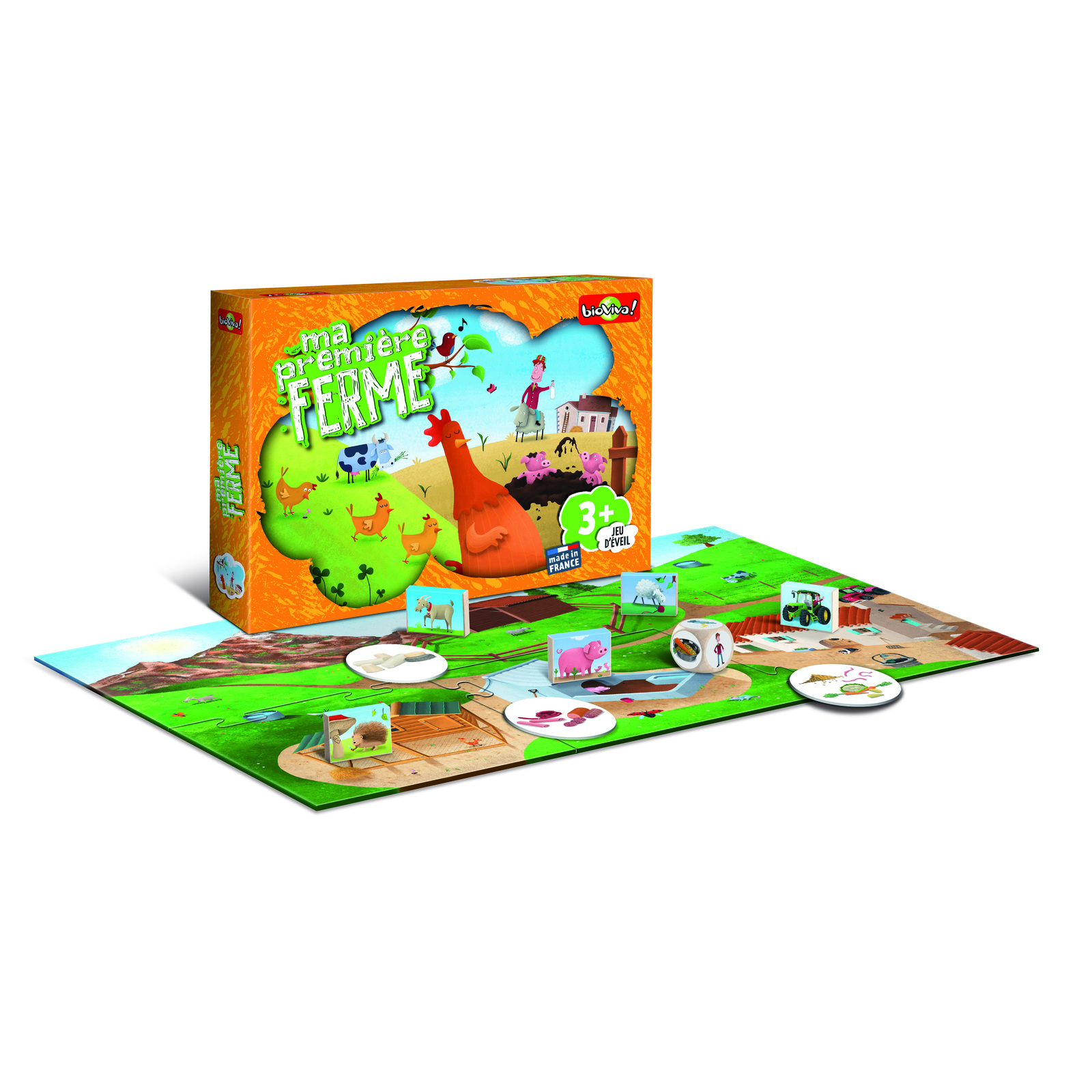 But du jeu : permet aux enfants de découvrir les joies de la vie à la campagne. En associant les bébés animaux à leurs parents, en les conduisant vers leurs lieux de vie, en les nourrissant, ou encore en récupérant leur production, ils apprennent le fonctionnement d'une ferme traditionnelle et l'importance des animaux sauvages pour préserver les équilibres naturels. Intérêt pédagogique : fonctionnement de la ferme. De 2 à 4 joueurs. Durée : 20 mn. Contenu : 1 plateau puzzle, 1 jeton fermier en bois, 15 pions animaux en bois, 10 jetons (nourriture, production), 1 livret pédagogique, 1 aide-mémoire spécial tout petits, 1 dé en bois et 1 règle du jeu