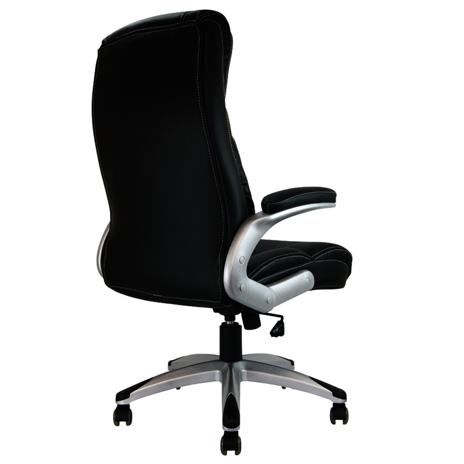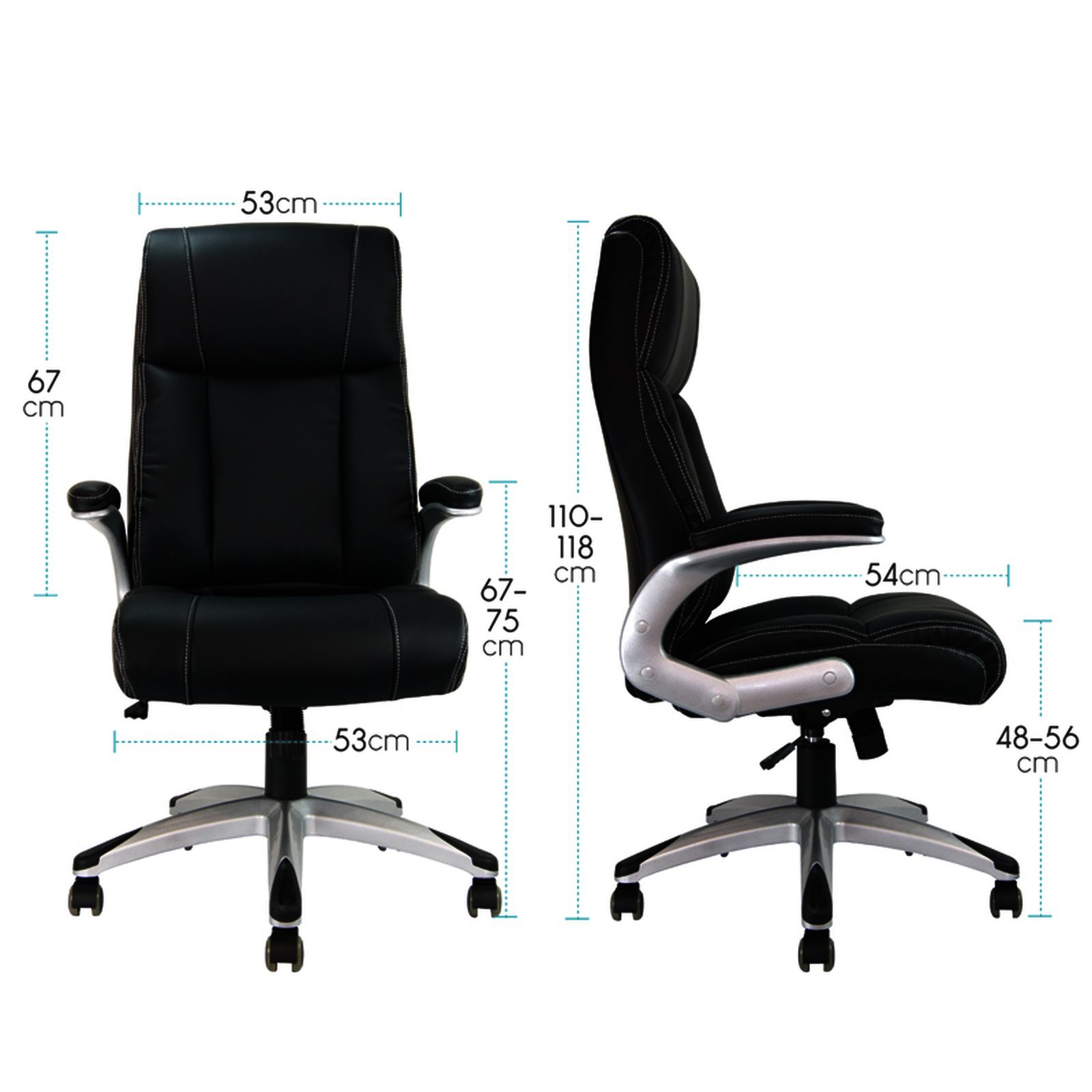 Régulation de la hauteur par pneumatique. Mécanisme désynchronisé : le dossier et le siège s'adaptent indépendamment aux mouvements de la personne assise. 5 roues en nylon Ø 6 cm. En imitation cuir noir et maille. Base solide et robuste en acier chromé. Accoudoirs fixes en polypropylène. Convient, pour une hauteur d'assise optimale, aux personnes mesurant de 185 cm à 205 cm. Poids maximum supporté : 130 kg. Usage régulier : de 5 à 8 heures par jour. Dimensions : 1110 + 100 x 610 x 640 mm. Poids : 12,6 kg.