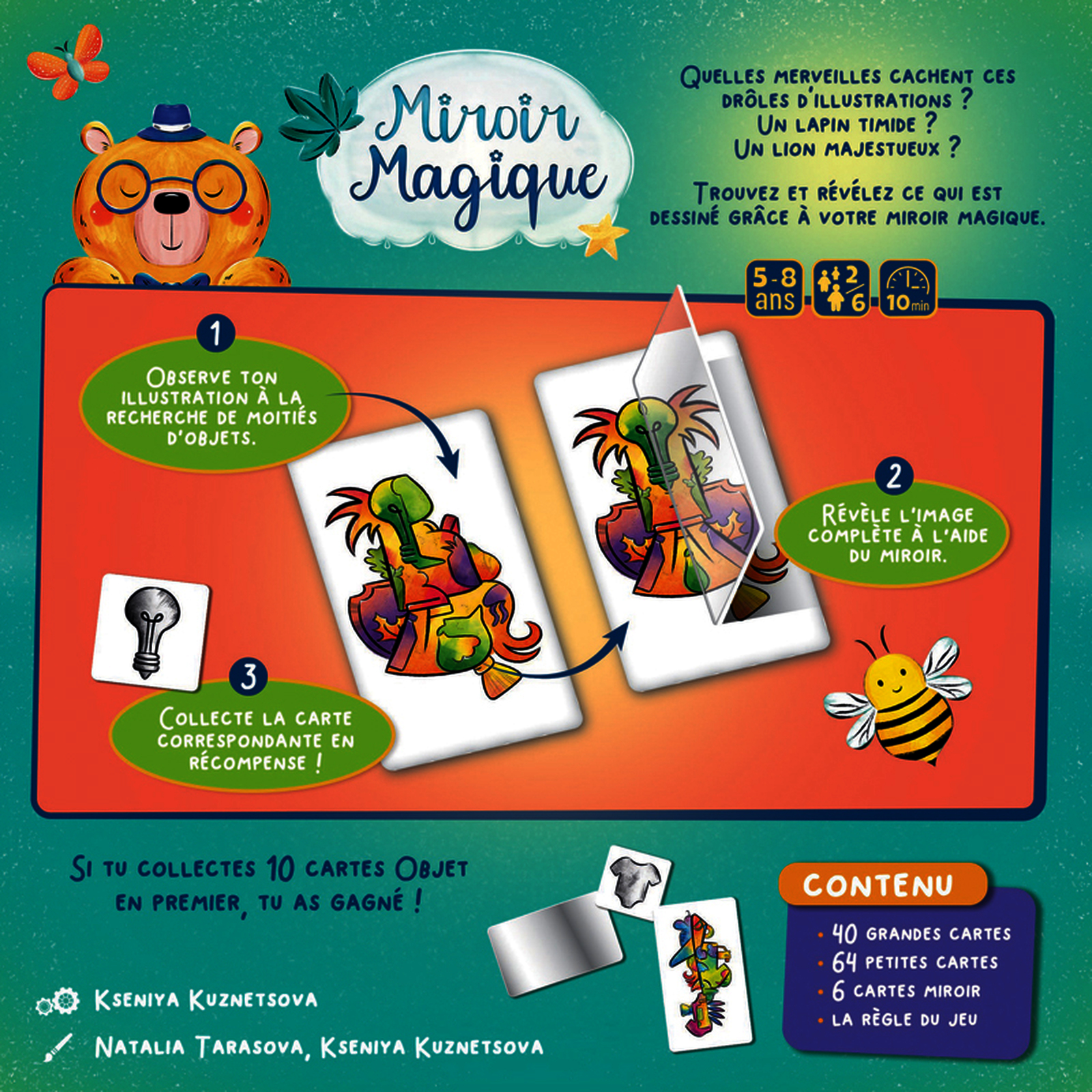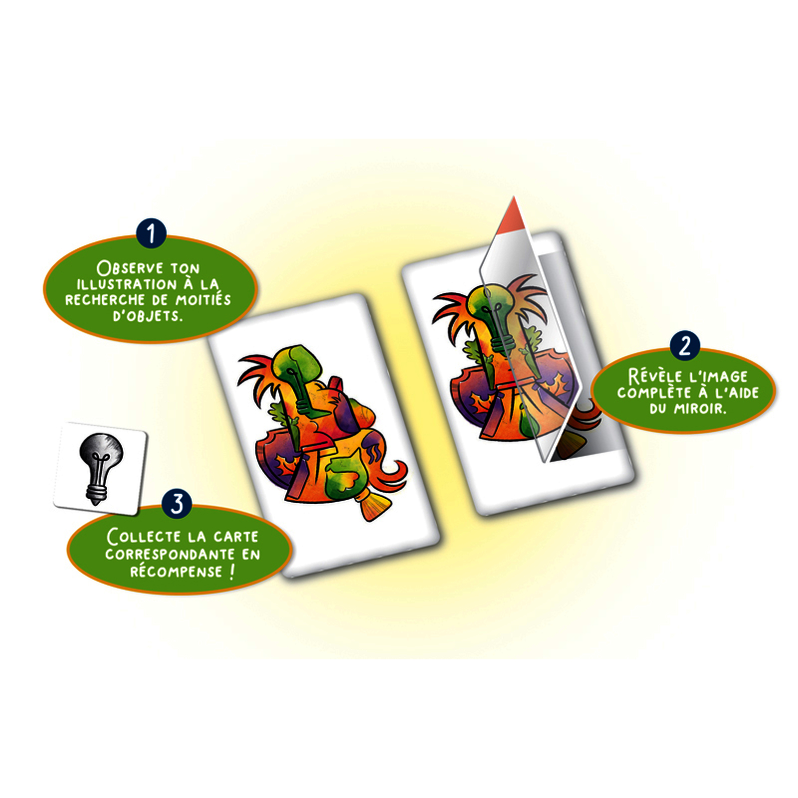 But du jeu : transformez les moiti?s d?image en un tout ? l'aide des cartes miroirs : une ligne courbe se r?v?le ?tre une aubergine, et un dr?le de gribouillis est en fait un palmier g?ant. La premi?re personne qui retrouve 10 objets gagne la partie !