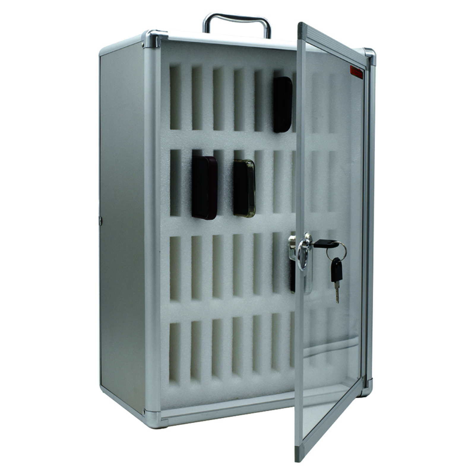 Bo?tier mural ? 40 emplacements avec serrure ? cl? et vitre plexiglas. Structure aluminium l?g?re et compartiment en mousse pour un rangement s?r et organis?. Fixation incluse.